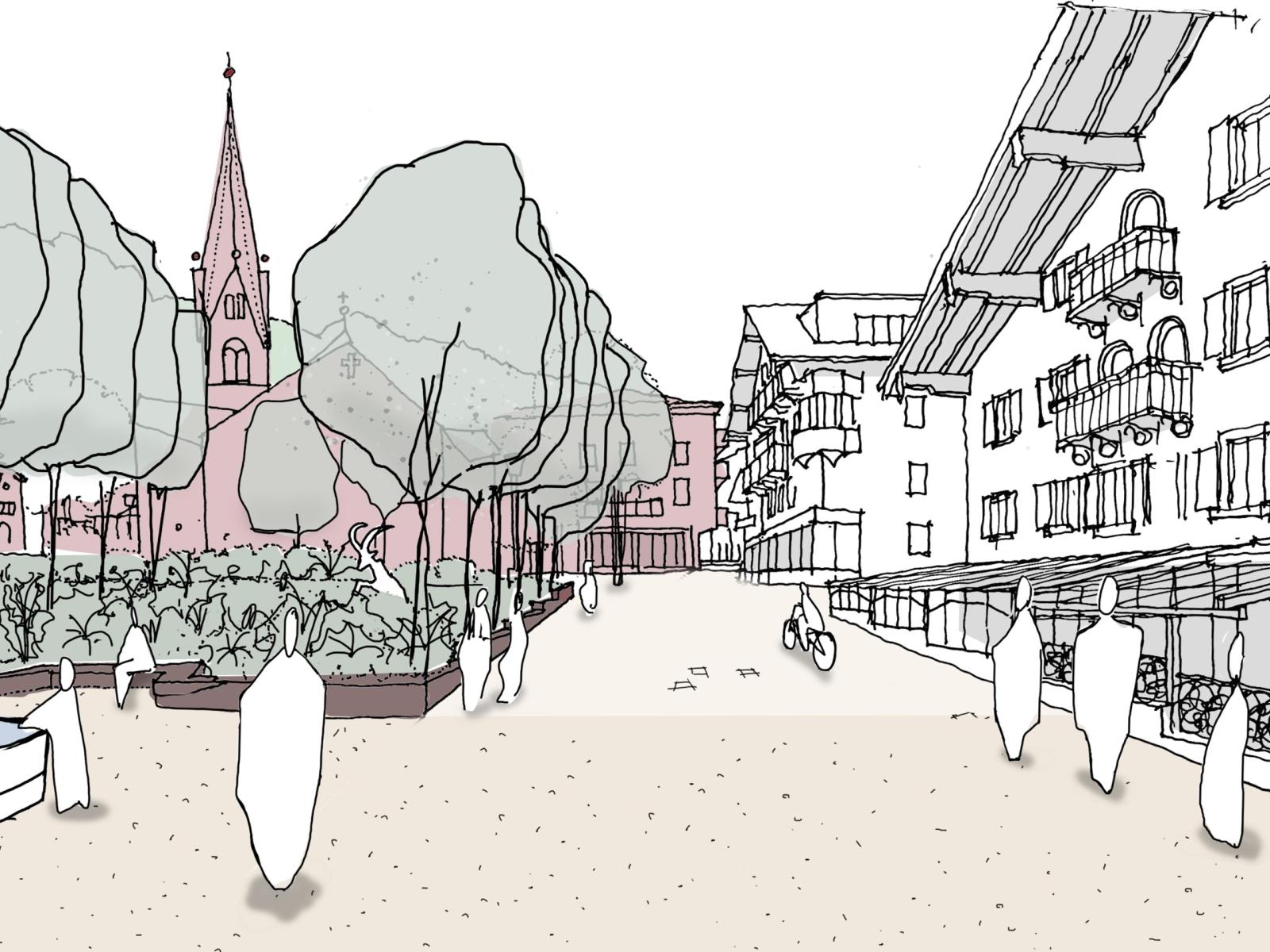 Menschen sollen einander begegnen statt durch das Zentrum durchfahren! Die Hauptstraße soll verkehrsberuhigt werden, um dem Flanieren und dem Aufenthalt mehr Platz zu verschaffen. Wir haben eine Begegnungszone empfohlen, die sich flexibel erweitern lässt.